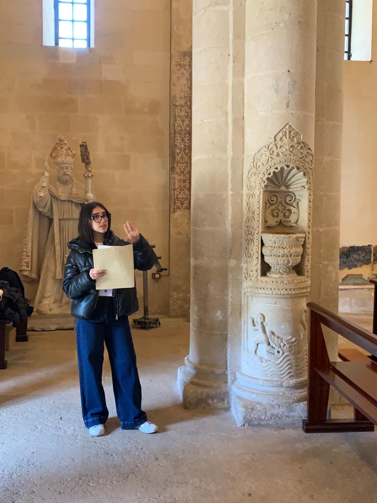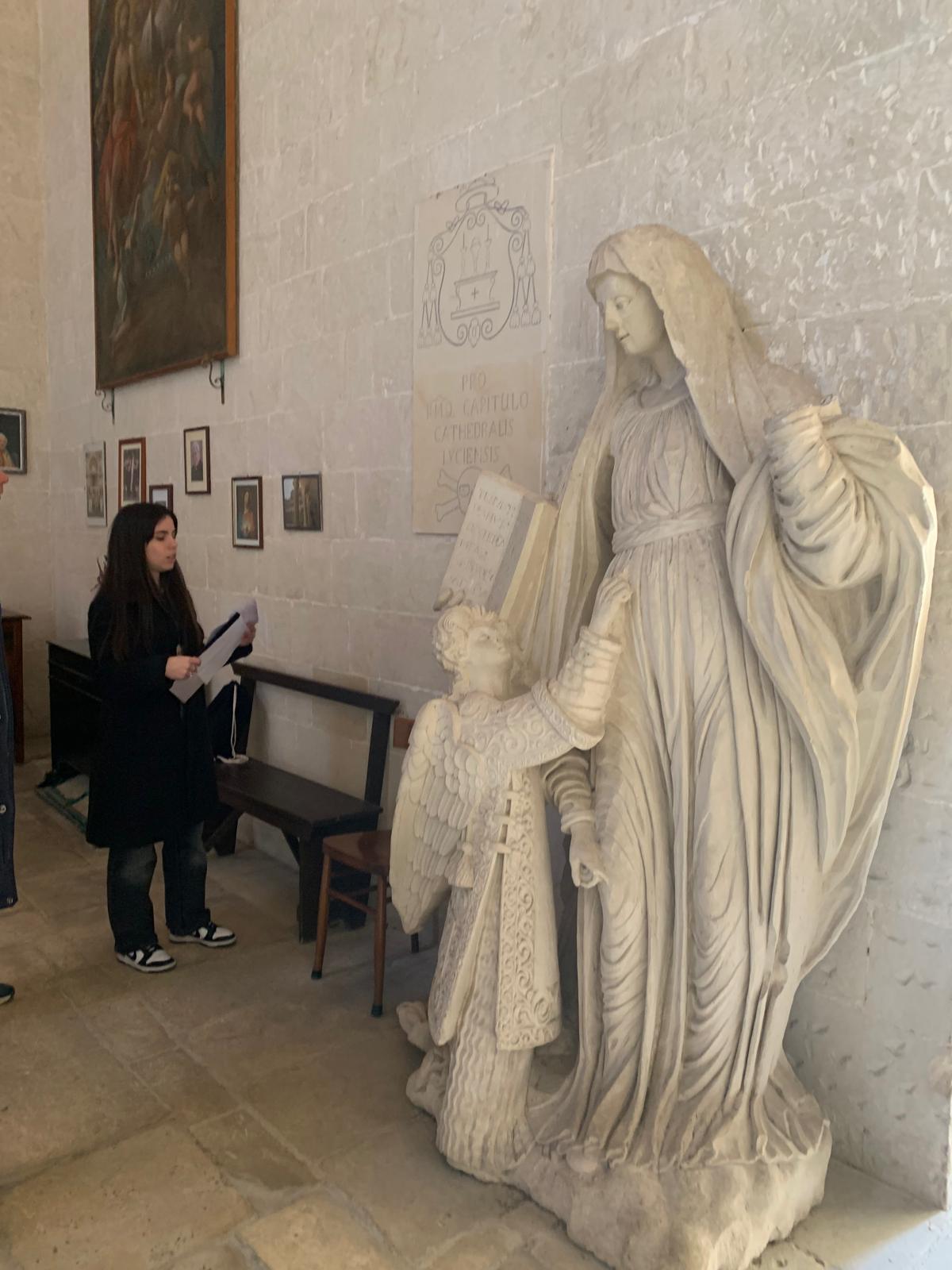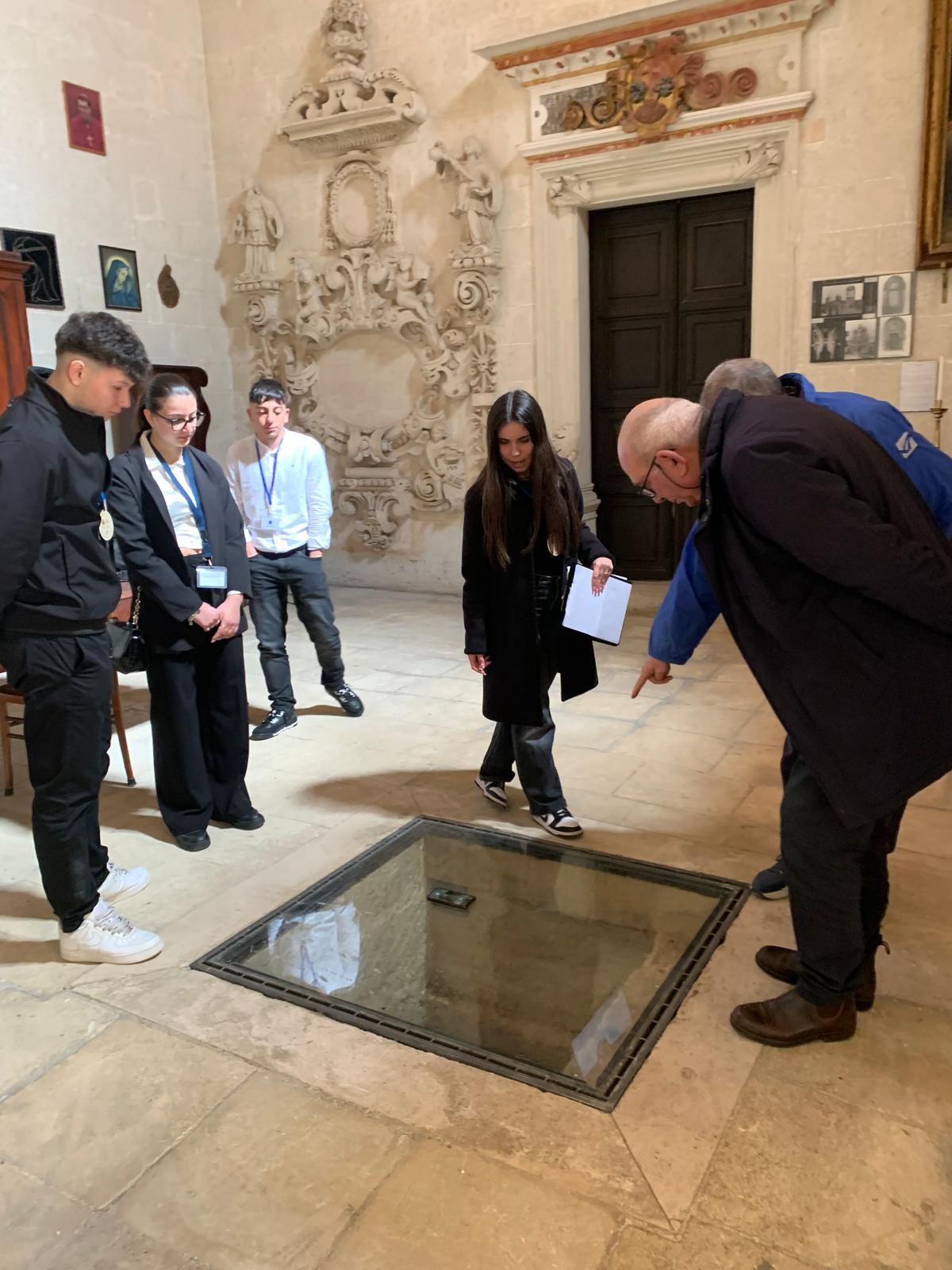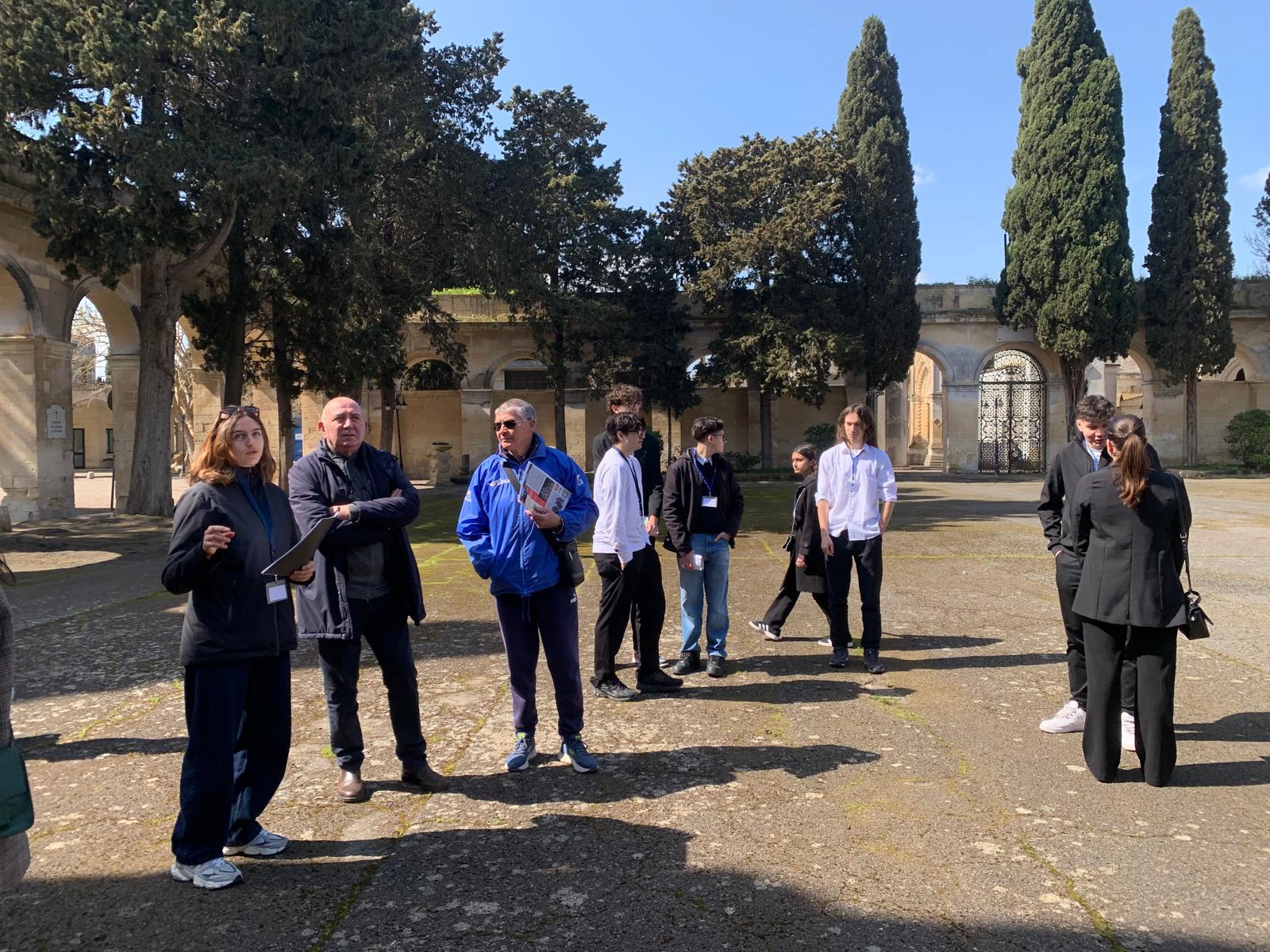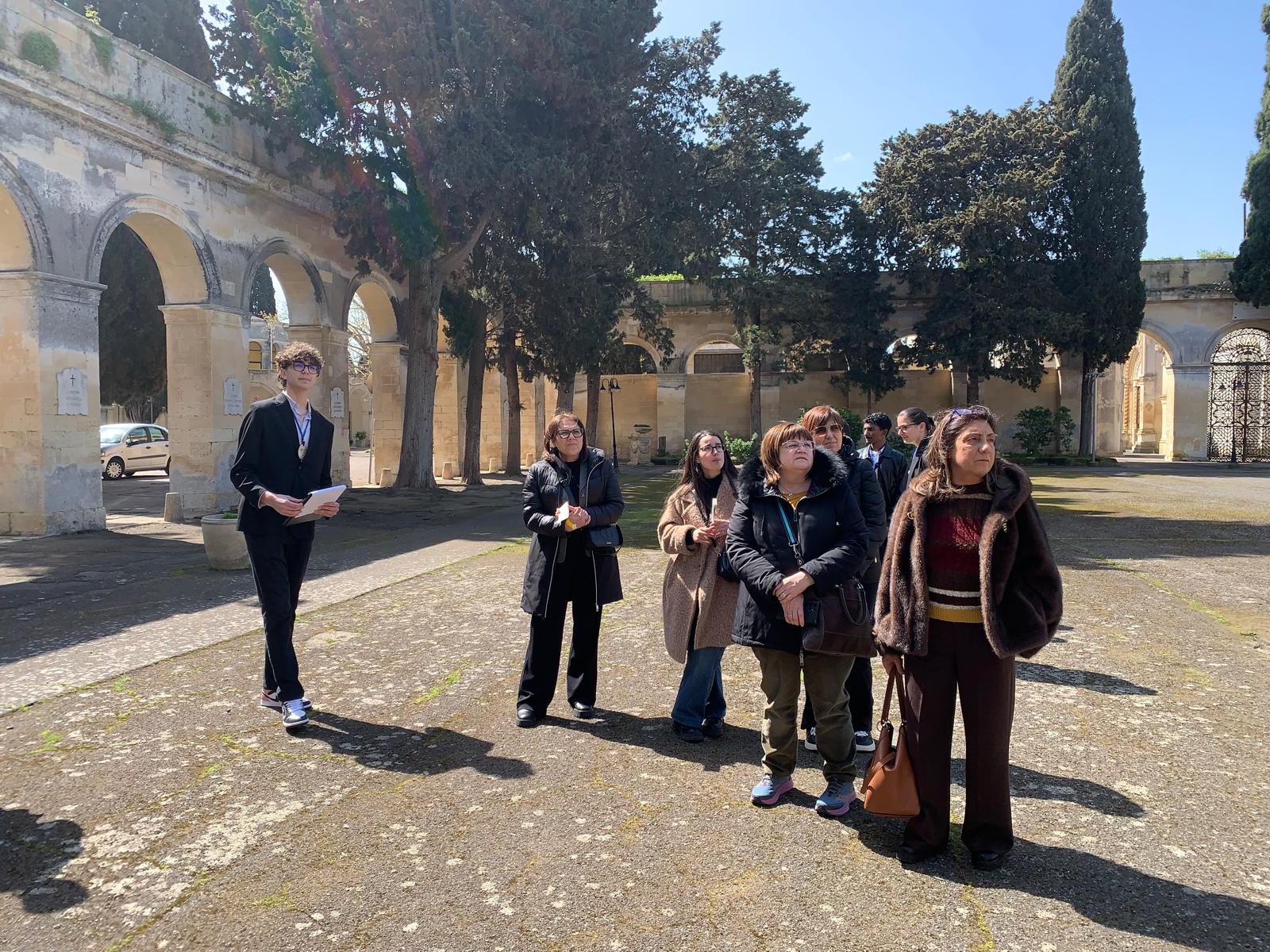 Nel ruolo di Ciceroni, gli studenti hanno accompagnato i visitatori alla scoperta della Chiesa dei Santi Niccolò e Cataldo, preziosa gemma del romanico pugliese situato presso il cimitero monumentale di Lecce. Con preparazione e passione, hanno raccontato la storia e le peculiarità artistiche del sito, trasformando la visita in un’esperienza emozionante e coinvolgente.