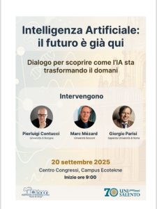 Sabato 20 settembre 2025 si è svolto presso il Centro Congressi del complesso Ecotekne dell’Università del Salento un importante evento sul tema dell’Intelligenza Artificiale, organizzato dal Dipartimento di Matematica e Fisica Ennio De Giorgi. L’incontro, intitolato “Intelligenza Artificiale: il futuro già qui”, ha offerto un dialogo approfondito su come l’IA stia rivoluzionando vari aspetti della nostra vita, con un focus particolare sugli aspetti matematici e fisici alla base di questa trasformazione.